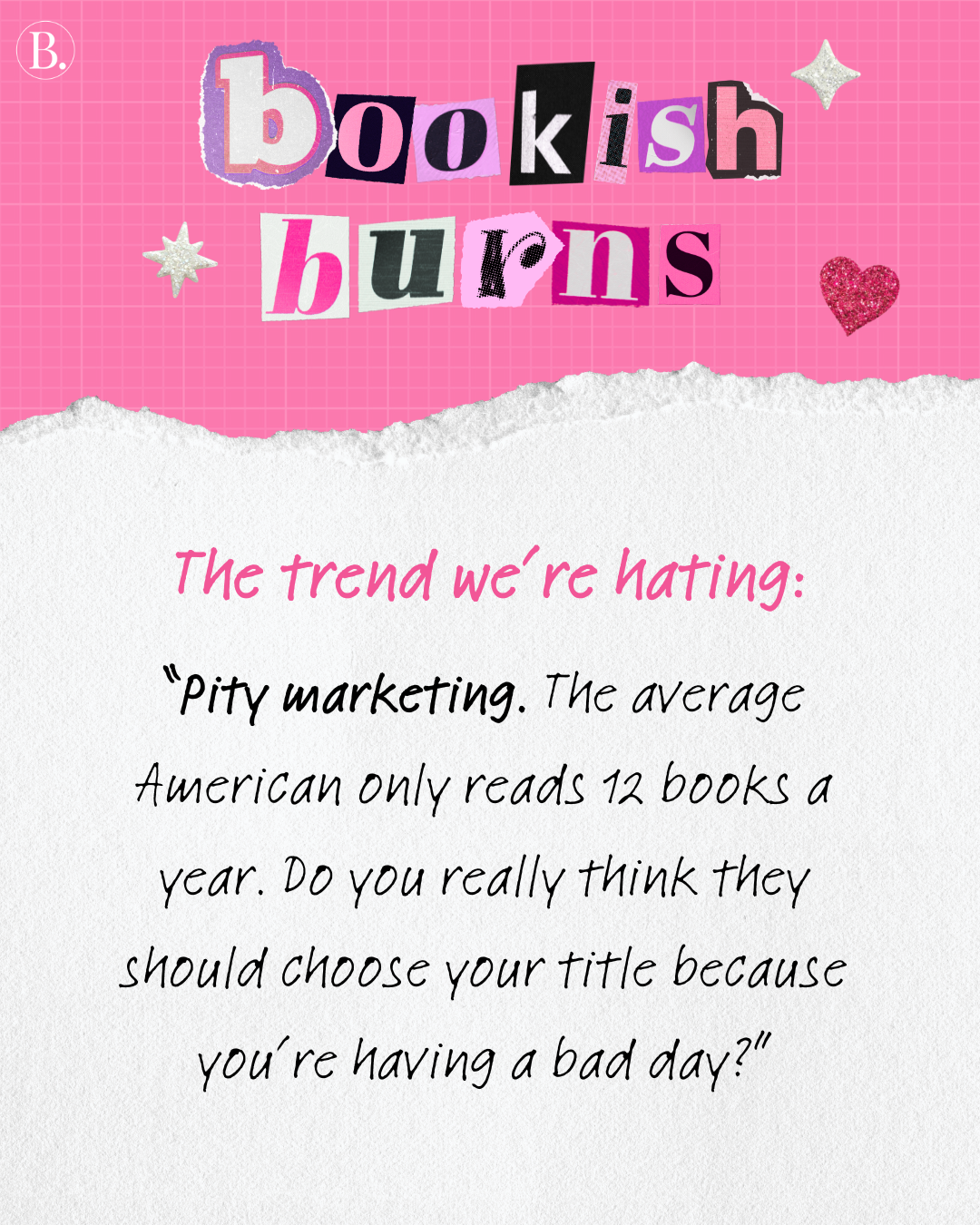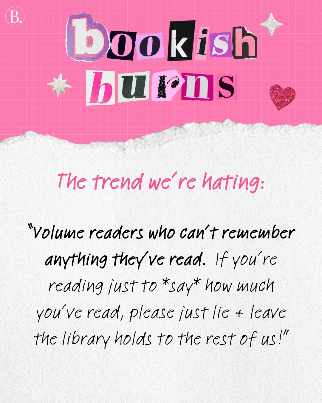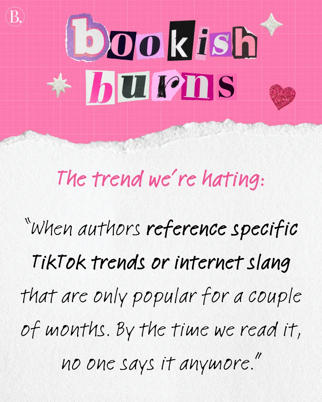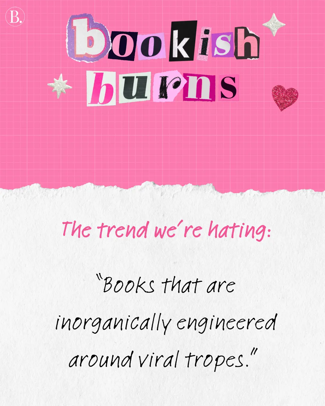 We asked the BookTrib team for their hottest book takes, from marketing moves to trope trickery. With the assurance of anonymity, everyone took a moment to vent. Scroll for some shocking bookish burns and find out if there are any that make you feel seen — or any that may ruffle some feathers.